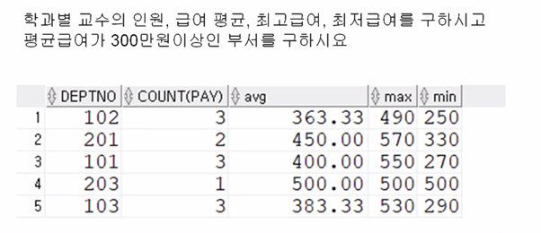 select deptno count(pay), to_char(round(avg(pay), 2),'999,999.99') "avg",