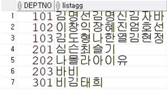 select deptno, listagg(name) within group(order by kiredate) listagg