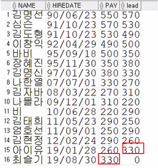 -> lag 함수와는 반대로 이후의 값을 가져오는 함수