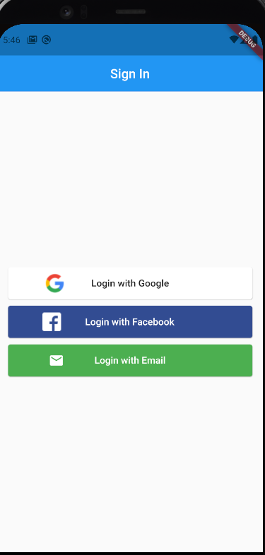 import 'package:flutter/cupertino.dart'; import 'package:flutter/material.dart'; void main() { runApp(MyApp()); } class MyApp extends StatelessWidget { @override Widget build(BuildContext context) { return MaterialApp( title: 'Login app', theme: ThemeData(primarySwatch: Colors.grey), home: LogIn(), ); } } class LogIn extends StatelessWidget { @override Widget build(BuildContext context) { return Scaffold( appBar: AppBar( backgroundColor: Colors.blue, title: Text( 'Sign In', style: TextStyle(color: Colors.white), ), centerTitle: true, elevation: 0.2, ), body: Padding( padding: EdgeInsets.all(16.0), child: Column( mainAxisAlignment: MainAxisAlignment.center, children: [ ElevatedButton( onPressed: () { print('TextButton Button'); }, child: Row( //spaceEvenly: 요소들을 균등하게 배치하는 속성 mainAxisAlignment: MainAxisAlignment.spaceEvenly, children: [ Image.asset('images/glogo.png'), Text('Login with Google', style: TextStyle(color: Colors.black87, fontSize: 15.0), ), Opacity( opacity: 0.0, child: Image.asset('images/glogo.png'), ), ], ), style: ElevatedButton.styleFrom( primary: Colors.white, //shadowColor: Colors.black, 그림자 추가하는 속성 minimumSize: Size.fromHeight(50), // 높이만 50으로 설정 elevation: 1.0, shape: RoundedRectangleBorder( // shape : 버튼의 모양을 디자인 하는 기능 borderRadius: BorderRadius.circular(4.0)), ), ), SizedBox( height: 10.0, ), ElevatedButton( onPressed: () { print('TextButton Button'); }, child: Row( //spaceEvenly: 요소들을 균등하게 배치하는 속성 mainAxisAlignment: MainAxisAlignment.spaceEvenly, children: [ Image.asset('images/flogo.png'), Text( 'Login with Facebook', style: TextStyle(color: Colors.white, fontSize: 15.0), ), Opacity( opacity: 0.0, child: Image.asset('images/glogo.png'), ), ], ), style: ElevatedButton.styleFrom( primary: Color(0xFF334D92), minimumSize: Size.fromHeight(50), elevation: 1.0, shape: RoundedRectangleBorder( borderRadius: BorderRadius.circular(4.0)), ), ), SizedBox( height: 10.0, ), ElevatedButton( onPressed: () { print('TextButton Button'); }, child: Row( //spaceEvenly: 요소들을 균등하게 배치하는 속성 mainAxisAlignment: MainAxisAlignment.spaceEvenly, children: [ Icon( Icons.mail, color: Colors.white, ), Text( 'Login with Email', style: TextStyle(color: Colors.white, fontSize: 15.0), ), Opacity( opacity: 0.0, child: Icon( Icons.mail, //color: Colors.white, ), ), ], ), style: ElevatedButton.styleFrom( primary: Colors.green, minimumSize: Size.fromHeight(50), elevation: 1.0, shape: RoundedRectangleBorder( borderRadius: BorderRadius.circular(4.0)), ), ), ], ), ), ); } }3. 결과 화면