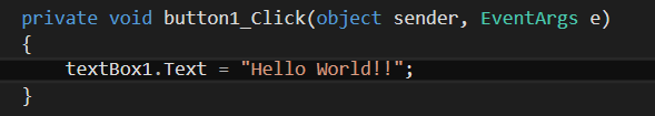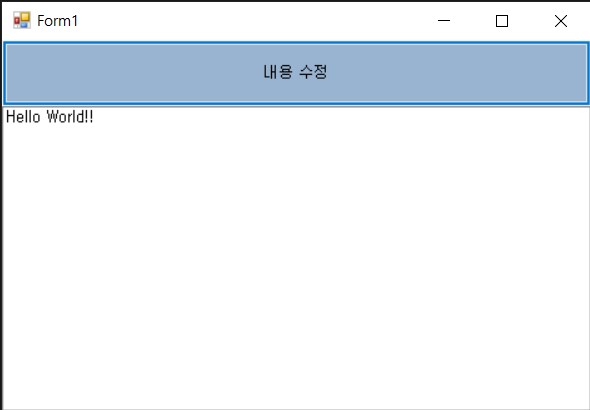 - Button1(내용 수정 버튼의 Name이 Button1 입니다.)을 클릭했을 때 textBox1(폼에 추가했던 textBox의 Name)의 Text를 "Hello World!!" 로 수정하겠다는 의미