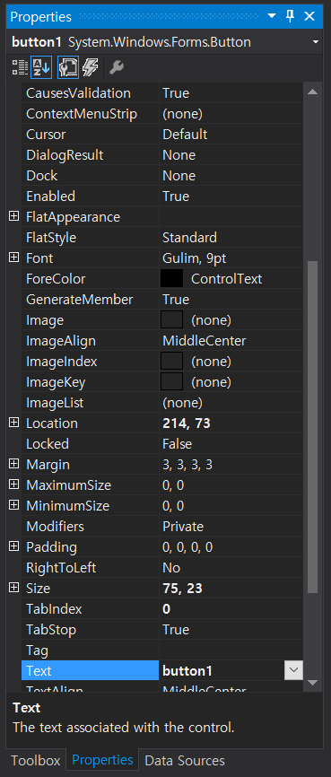 - ToolBox에서 버튼 컨트롤 선택해 추가 후, Properties 에서 Text를 '내용 수정' 으로 변경