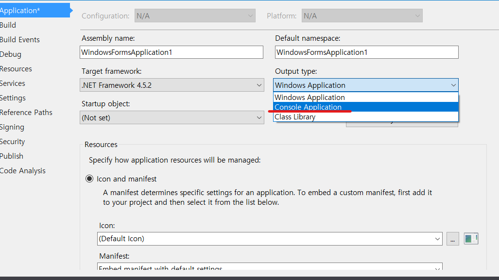 Window Application에서 Colsole Application으로 바꿔줍니다.