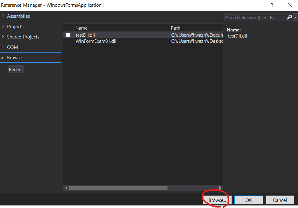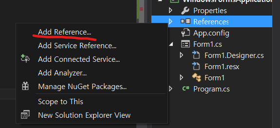 이제 아까 만들어둔 윈도우 폼 프로젝트에 방금 만든 DLL을 넣어줍니다.