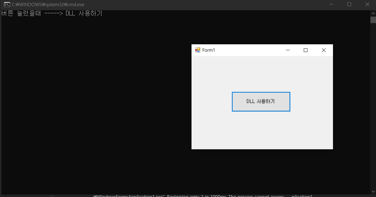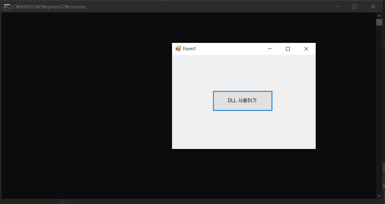 using System; using System.Collections.Generic; using System.ComponentModel; using System.Data; using System.Drawing; using System.Linq; using System.Text; using System.Threading.Tasks; using System.Windows.Forms; using testDll; namespace WindowsFormsApplication1 { public partial class Form1 : Form { public Form1() { InitializeComponent(); } private void button1_Click(object sender, EventArgs e) { TestDllClass testDllClass = new TestDllClass(); testDllClass.WriteConsole("버튼 눌렀을때 -----> "); } } }결과를 콘솔로 보고 싶기 때문에