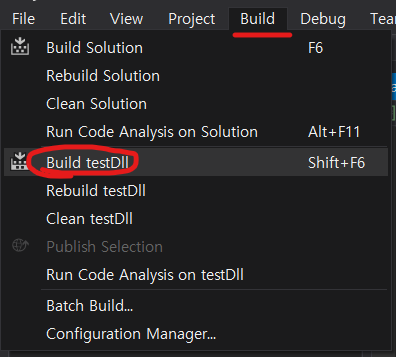 - 방금 빌드했던 DLL 파일은 해당 프로젝트 -> testDll -> bin -> Debug 안에 있을 겁니다.
