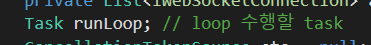 if(runLoop == null || runLoop.Status == TaskStatus.RanToCompletion) { MessageBox.Show("loop 실행"); Console.WriteLine("Run " + message + "..."); allSockets.ToList().ForEach(s => s.Send("Echo: Run " + message + "...")); RunClientLoop(); }Null 체크 하는 습관을 들여야겠다.