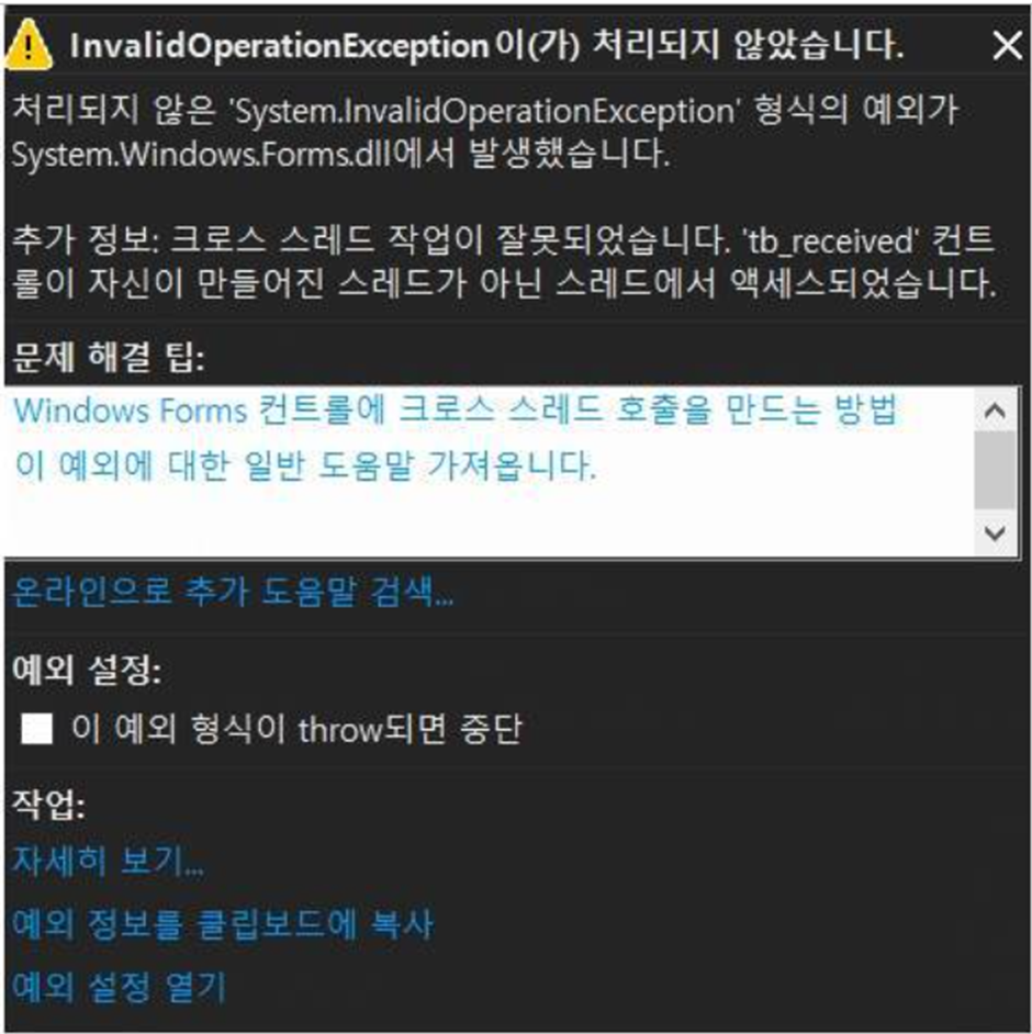 - 메인 스레드가 아닌 다른 스레드에서 ui 컨트롤에 접근하려고 하기 때문이다.