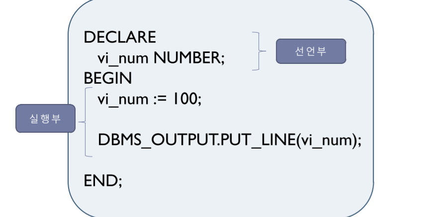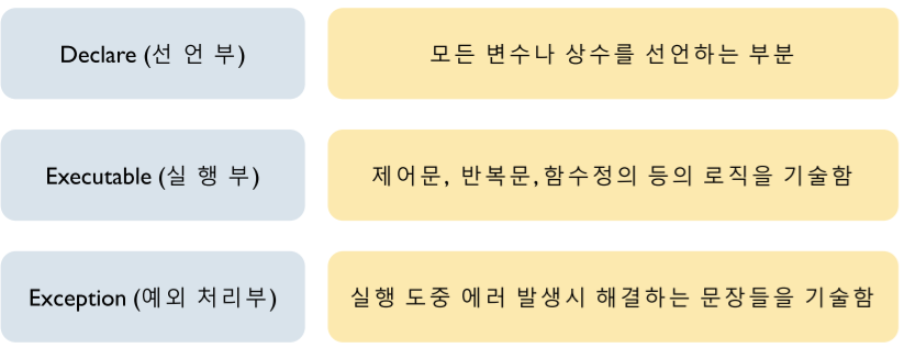 - 선언부(DECLARE), 실행부(BEGIN), 예외처리부 (EXCEPTION)로 구성됨.