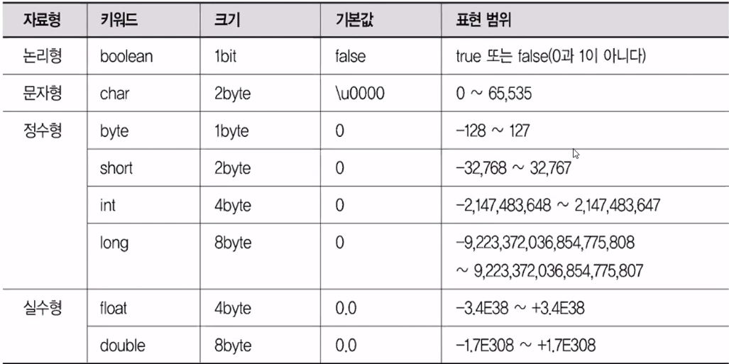 package javaPro.java_var; public class VarEx1 { public static void main(String[] args) { //프로그램의 시작점 //변수의 선언 및 초기화 byte b1 = -22; byte b2; //변수의 선언. b2 저장공간 메모리 1바이트 할당. //바이트로 저장할 수 있는 값의 범위. -128 ~ 127 저장가능 b2= -128; //변수의 초기화 b1=127; short s1 = -220; int i1 = 100; long l1 = 1000l; //변수값 내용을 화면에 출력하기 //System.out.println : 화면에 값을 출력. System.out.println("b1=" + b1); //b1=-22 System.out.println("s1="+s1); System.out.println("i1="+i1); System.out.println("l1="+l1); float f1 = 1.0f; double d1 = 1.0; double d12 = 1d; System.out.println("f1=" + f1); System.out.println("d1=" + d1); /* * 실수형 리터널의 기본자료형은 double 임 * float 리터널로 표시하기 위해서는 접미사를 붙여야 한다. * F,f : float 리터널 * D,d : double 리터널 * L,l : long 리터널 */ } } /* * 자료형 * 기본형 - 논리형 : boolean(1) * 문자형 : char(2) * 정수형 : byte(1), short(2), int(4), long(8) * 실수형 : float(4), double(8) * 참조형 - 배열, 클래스, 인터페이스 * */-> 형변환 예시