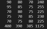 package javaPro.java_array; //2차원 배열보다 가로, 세로가 1씩 더 큰 배열 result를 생성하여, 마지막 행과 열에 합계를 저장하는 프로그램을 구현 public class arrayEx15 { public static void main(String[] args) { int[][] score = { {90, 80, 70}, {95, 85, 75}, {70, 80, 75}, {75, 70, 85}, {70, 75, 80} }; int [][] result = new int[score.length+1][score[0].length + 1];// score.length는 인덱스라 + 1을 해준 것 for (int i = 0; i < score.length; i++) { for (int j = 0; j < score[i].length; j++) { result[i][j] = score[i][j]; // 일반 열 값 넣기 result[i][score[i].length] += score[i][j];//행 result[score.length][j] += score[i][j];// 열 result[score.length][score[i].length] += score[i][j];//전체 } } for (int i = 0; i < result.length; i++) { for (int j = 0; j < result[i].length; j++) { System.out.printf("%5d", result[i][j]); } System.out.println(); } } }