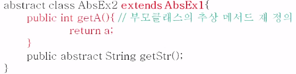 - 그냥 상속만 받아두고 있다가 언젠가 일반 클래스와 상속관계가 이루어 질 때가 있을 것 이고, 이때 재정의 하지 못했던 상속 받은 추상 메서드들을 모두 일반 클래스 내에서 재정의 해도 되기 때문이다.