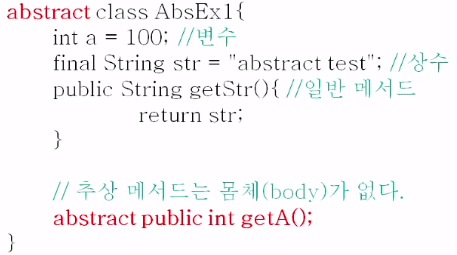 - 메소드의 끝이 {}없이 :(세미콜론) 으로 마무리된다. 추상클래스로부터 상속을 받는 경우 추상메소드의 바디부분을 반 드시 구현해야 한다. 반드시 추상메소드는 오버라이딩해야 한다.