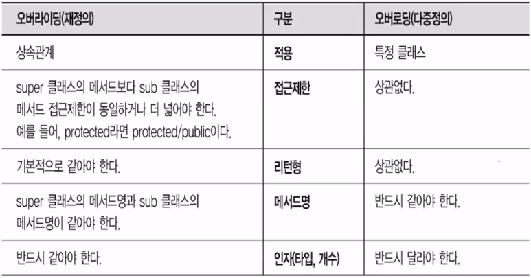 - 2. 서브클래스에서 재정의 되는 메소드의 접근제어자(public, private 등)는 슈퍼클래스의 오버라이드되는 메소드의 접근제어자와 같거나, 덜 제한적인 접근제어자를 써야한다.(슈퍼클래스에서 public을 썼는데 자식 클래스가 private를 쓸 수 없다.)