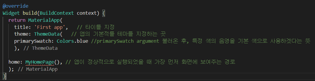 -> 매우 간단한 코딩시에는 상관 없지만 코딩 양이 많아져 복잡해진다면 페이지를 나눠 체계적인 코딩을 하기 위해 이렇게 MyHomePage 위젯을 추가해주는 것이 좋다.