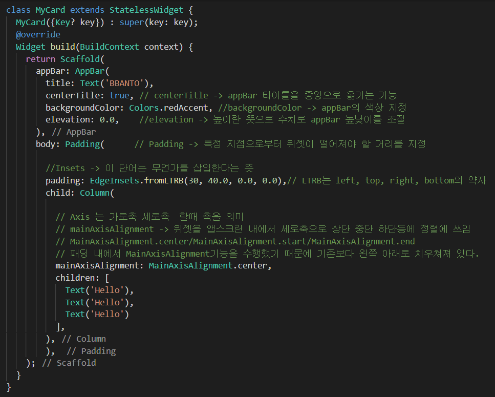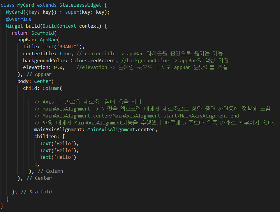- 즉 column 위젯을 가로축 상으로 정중앙에 위치시키려면 center 위젯을 사용하고, 세로축으로 정중앙에 위치시키려면 컬럼 위젯 내에서 MainAxisAlignment 속성을 사용한다.