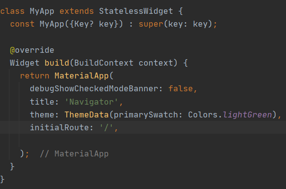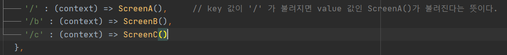 import 'package:flutter/material.dart'; import 'package:flutter_ch23_navigator/ScreenA.dart'; import 'package:flutter_ch23_navigator/ScreenB.dart'; import 'package:flutter_ch23_navigator/ScreenC.dart'; void main(List<String> args) { runApp(MyApp()); } class MyApp extends StatelessWidget { const MyApp({Key? key}) : super(key: key); @override Widget build(BuildContext context) { return MaterialApp( debugShowCheckedModeBanner: false, title: 'Navigator', theme: ThemeData(primarySwatch: Colors.lightGreen), initialRoute: '/', routes: { '/' : (context) => ScreenA(), // key 값이 '/' 가 불려지면 value 값인 ScreenA()가 불려진다는 뜻이다. '/b' : (context) => ScreenB(), '/c' : (context) => ScreenC() }, ); } }[ScreenA]