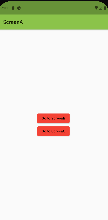 import 'package:flutter/material.dart'; class ScreenA extends StatelessWidget { const ScreenA({Key? key}) : super(key: key); @override Widget build(BuildContext context) { return Scaffold( appBar: AppBar( title: Text('ScreenA'), ), body: Center( child: Column( mainAxisAlignment: MainAxisAlignment.center, children: [ ElevatedButton( style: ElevatedButton.styleFrom( primary: Colors.red, ), onPressed: (){ Navigator.pushNamed(context, '/b'); }, child: Text('Go to ScreenB')), ElevatedButton( style: ElevatedButton.styleFrom( primary: Colors.red, ), onPressed: (){ Navigator.pushNamed(context, '/c'); }, child: Text('Go to ScreenC')) ], ), ), ); } }[ScreenB]