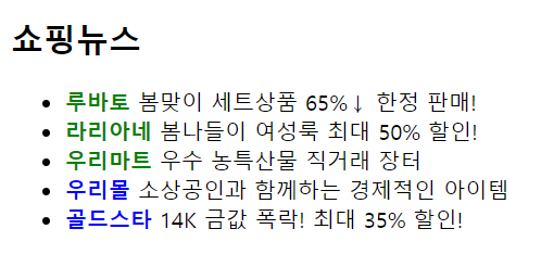 <!DOCTYPE html> <html> <head> <!-- <meta charset='utf-8'> --> <style> .green { color: green; font-weight: bold; } .blue { color: blue; font-weight: bold; } </style> </head> <body> <h2>쇼핑뉴스</h2> <ul> <li><span class='green'>루바토</span> 봄맞이 세트상품 65%↓ 한정 판매!</li> <li><span class='green'>라리아네</span> 봄나들이 여성룩 최대 50% 할인!</li> <li><span class='green'>우리마트</span> 우수 농특산물 직거래 장터</li> <li><span class='blue'>우리몰</span> 소상공인과 함께하는 경제적인 아이템</li> <li><span class='blue'>골드스타</span> 14K 금값 폭락! 최대 35% 할인!</li> </ul> </body> </html>[결과]