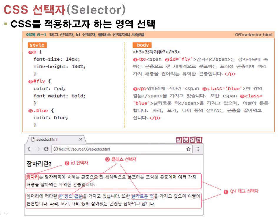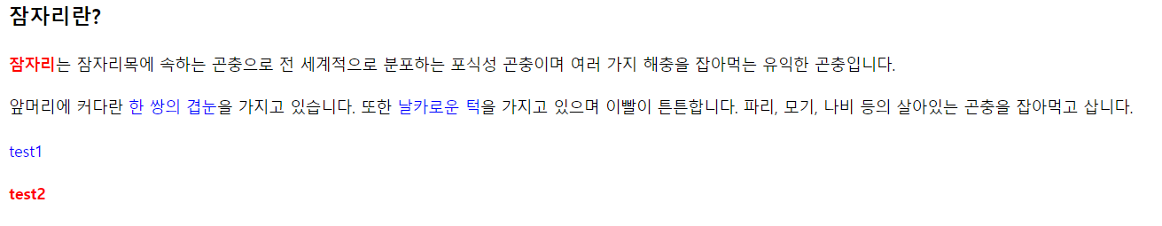 <!DOCTYPE html> <html> <head> <style> p { font-size: 14px; line-height: 180%; } #fly { color: red; font-weight: bold; } .blue { color: blue; } </style> </head> <body> <h3>잠자리란?</h3> <p><span class="blue" , id='fly'>잠자리</span>는 잠자리목에 속하는 곤충으로 전 세계적으로 분포하는 포식성 곤충이며 여러 가지 해충을 잡아먹는 유익한 곤충입니다.</p> <p>앞머리에 커다란 <span class='blue'>한 쌍의 겹눈</span>을 가지고 있습니다. 또한 <span class='blue'>날카로운 턱</span>을 가지고 있으며 이빨이 튼튼합니다. 파리, 모기, 나비 등의 살아있는 곤충을 잡아먹고 삽니다.</p> <p class="blue"> test1</p> <p id="fly"> test2</p> </body> </html>[결과]