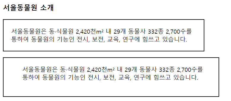 <!DOCTYPE html> <html> <head> <!-- <meta charset='utf-8'> --> <style> p { width: 500px; border: solid 2px black; } #padding1 { padding: 20px; } #padding2 { padding-top: 20px; padding-right: 30px; padding-bottom: 40px; padding-left: 50px; /* padding: 20px 30px 40px 50px; */ } </style> </head> <body> <h3>서울동물원 소개</h3> <p id='padding1'>서울동물원은 동·식물원 2,420천m² 내 29개 동물사 332종 2,700수를 통하여 동물원의 기능인 전시, 보전, 교육, 연구에 힘쓰고 있습니다.</p> <p id='padding2'>서울동물원은 동·식물원 2,420천m² 내 29개 동물사 332종 2,700수를 통하여 동물원의 기능인 전시, 보전, 교육, 연구에 힘쓰고 있습니다.</p> </body> </html>[결과]