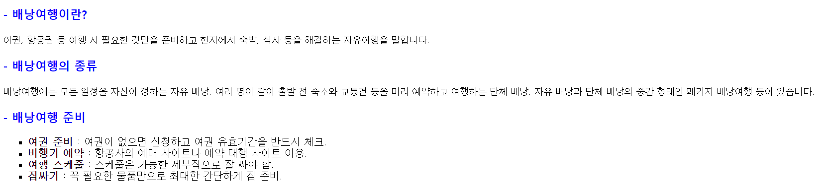 <!DOCTYPE html> <html> <head> <style> body { font-family: '돋움'; } h3 { font-family: '맑은고딕'; color: blue; } p { font-size: 14px; line-height: 150%; } li { list-style-type: square; font-size: 16px; } span { font-weight: bold; } </style> </head> <body> <h3> - 배낭여행이란?</h3> <p>여권, 항공권 등 여행 시 필요한 것만을 준비하고 현지에서 숙박, 식사 등을 해결하는 자유여행을 말합니다.</p> <h3>- 배낭여행의 종류</h3> <p>배낭여행에는 모든 일정을 자신이 정하는 자유 배낭, 여러 명이 같이 출발 전 숙소와 교통편 등을 미리 예약하고 여행하는 단체 배낭, 자유 배낭과 단체 배낭의 중간 형태인 패키지 배낭여행 등이 있습니다. </p> <h3>- 배낭여행 준비</h3> <ul> <li><span>여권 준비</span> : 여권이 없으면 신청하고 여권 유효기간을 반드시 체크.</li> <li><span>비행기 예약</span> : 항공사의 예매 사이트나 예약 대행 사이트 이용.</li> <li><span>여행 스케줄</span> : 스케줄은 가능한 세부적으로 잘 짜야 함.</li> <li><span>짐싸기</span> : 꼭 필요한 물품만으로 최대한 간단하게 짐 준비.</li> </ul> </body> </html>[결과]