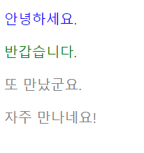 <!DOCTYPE html> <html> <head> <!-- <meta charset='utf-8'> --> <style> p { color: gray; } #p1 { color: blue; } #p2 { color: green; } </style> </head> <body> <p id='p1'>안녕하세요.</p> <p id='p2'>반갑습니다.</p> <p>또 만났군요.</p> <p>자주 만나네요!</p> </body> </html>[결과]