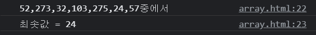 <!DOCTYPE html> <html> <head> <meta charset="EUC-KR"> <title></title> <script> function min(array) { let output = array[0] for (const item of array) { // 현재 output 보다 더 작은 item 이 있다면 if (output > item) { //output 값으로 변경 output = item } } return output } const testArray = [52, 273, 32, 103, 275, 24, 57] console.log(`${testArray}중에서 `) console.log(`최솟값 = ${min(testArray)}`) </script> </head> <body> </body> </html>