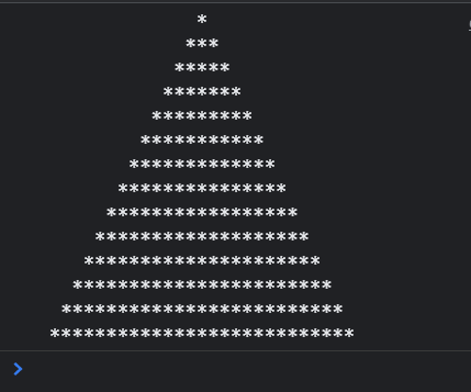 <!DOCTYPE html> <html> <head> <meta charset="EUC-KR"> <title></title> <script> let output = '' for (let i = 1; i < 15; i++) { for (let j = 15; j > i; j--) { output += ' ' } for (let k = 0; k < 2 * i - 1; k++) { output += '*' } output += '\n' } //출력 console.log(output) </script> </head> <body> </body> </html>