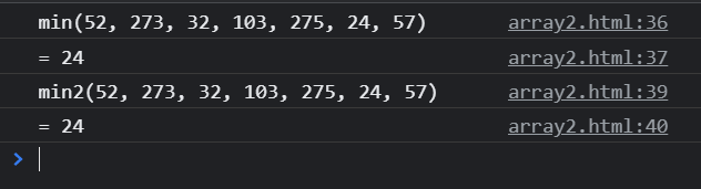 <!DOCTYPE html> <html> <head> <meta charset="EUC-KR"> <title></title> <script> function min(...items) { //매개변수 items는 배열처럼 사용한다. let output = items[0] for (const item of items) { // 현재 output 보다 더 작은 item 이 있다면 if (output > item) { //output 값으로 변경 output = item } } return output } // 함수를 이름만 선언 해놓고 arguments 예약어로 파라미터를 받아올 수 있다. function min2() { let output = arguments[0] for (const item of arguments) { // 현재 output 보다 더 작은 item 이 있다면 if (output > item) { //output 값으로 변경 output = item } } return output } console.log('min(52, 273, 32, 103, 275, 24, 57)') console.log(`= ${min(52, 273, 32, 103, 275, 24, 57)}`) //위와 같은 결과를 출력한다. console.log('min2(52, 273, 32, 103, 275, 24, 57)') console.log(`= ${min2(52, 273, 32, 103, 275, 24, 57)}`) </script> </head> <body> </body> </html>