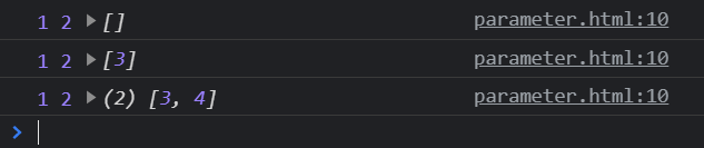 <!DOCTYPE html> <html> <head> <meta charset="EUC-KR"> <title></title> <script> // a, b 이후로는 배열로 받겠다는 의미 function sample(a, b, ...c) { console.log(a, b, c) // a, b 는 변수, c는 배열로 출력 } sample(1, 2) sample(1, 2, 3) sample(1, 2, 3, 4) </script> </head> <body> </body> </html>
