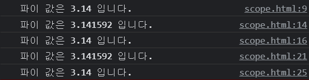 <!DOCTYPE html> <html> <head> <meta charset="EUC-KR"> <title>Insert titlte here</title> <script> let pi = 3.14 console.log(`파이 값은 ${pi} 입니다.`) //블록을 사용한 스코프 생성 { let pi = 3.141592 console.log(`파이 값은 ${pi} 입니다.`) } console.log(`파이 값은 ${pi} 입니다.`) //함수 블록을 사용한 스코프 생성 function sample() { let pi = 3.141592 console.log(`파이 값은 ${pi} 입니다.`) } sample() console.log(`파이 값은 ${pi} 입니다.`) </script> </head> <body> </body> </html>