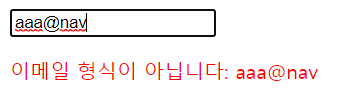 <!DOCTYPE html> <html> <head> <title></title> <script> document.addEventListener('DOMContentLoaded', () => { // input 과 p 태그에 DOM 설정 const input = document.querySelector('input') const p = document.querySelector('p') const isEmail = (value) => { // 골뱅이를 갖고 있고 && 골뱅이 뒤에 점이 있다면 // indexOf() -> 문자열 내에서 특정한 문자열의 index 값을 리턴한다. 없을 경우 -1 리턴 return (value.indexOf('@') > 1) && (value.split('@')[1].indexOf('.') > 1) } input.addEventListener('keyup', (event) => { const value = event.currentTarget.value if (isEmail(value)) { p.style.color = 'green' p.textContent = `이메일 형식입니다: ${value}` } else { p.style.color = 'red' p.textContent = `이메일 형식이 아닙니다: ${value}` } }) }) </script> </head> <body> <input type="text"> <p></p> </body> </html>