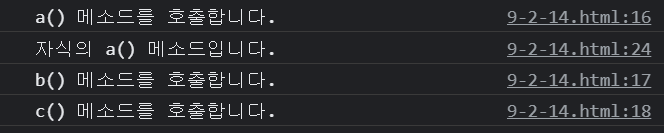 <!DOCTYPE html> <html> <head> <meta charset="EUC-KR"> <title></title> <title></title> <script> // 클래스를 선언합니다. class LifeCycle { call () { this.a() this.b() this.c() } a () { console.log('a() 메소드를 호출합니다.')} b () { console.log('b() 메소드를 호출합니다.')} c () { console.log('c() 메소드를 호출합니다.')} } class Child extends LifeCycle { a () { super.a() console.log('자식의 a() 메소드입니다.') } } // 인스턴스를 생성합니다. new Child().call() </script> </head> <body> </body> </html>