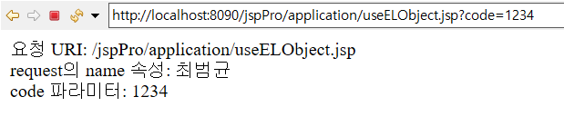 <%@ page language="java" contentType="text/html; charset=UTF-8" pageEncoding="UTF-8"%> <% request.setAttribute("name", "최범균"); %> <!DOCTYPE html> <html> <head> <meta charset = "UTF-8"> <title>Insert title here</title> </head> <body> 요청 URI: ${pageContext.request.requestURI}<br> request의 name 속성: ${requestScope.name}<br> code 파라미터: ${param.code} </body> </html>
