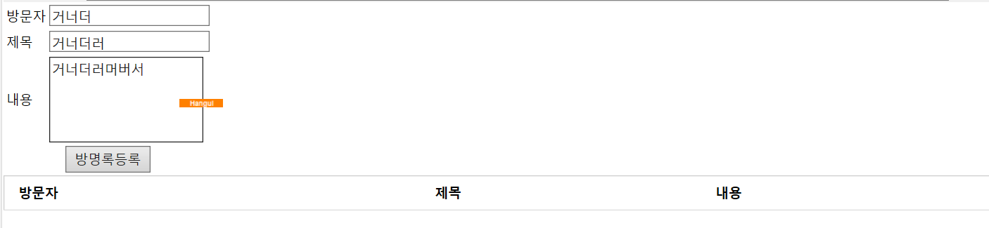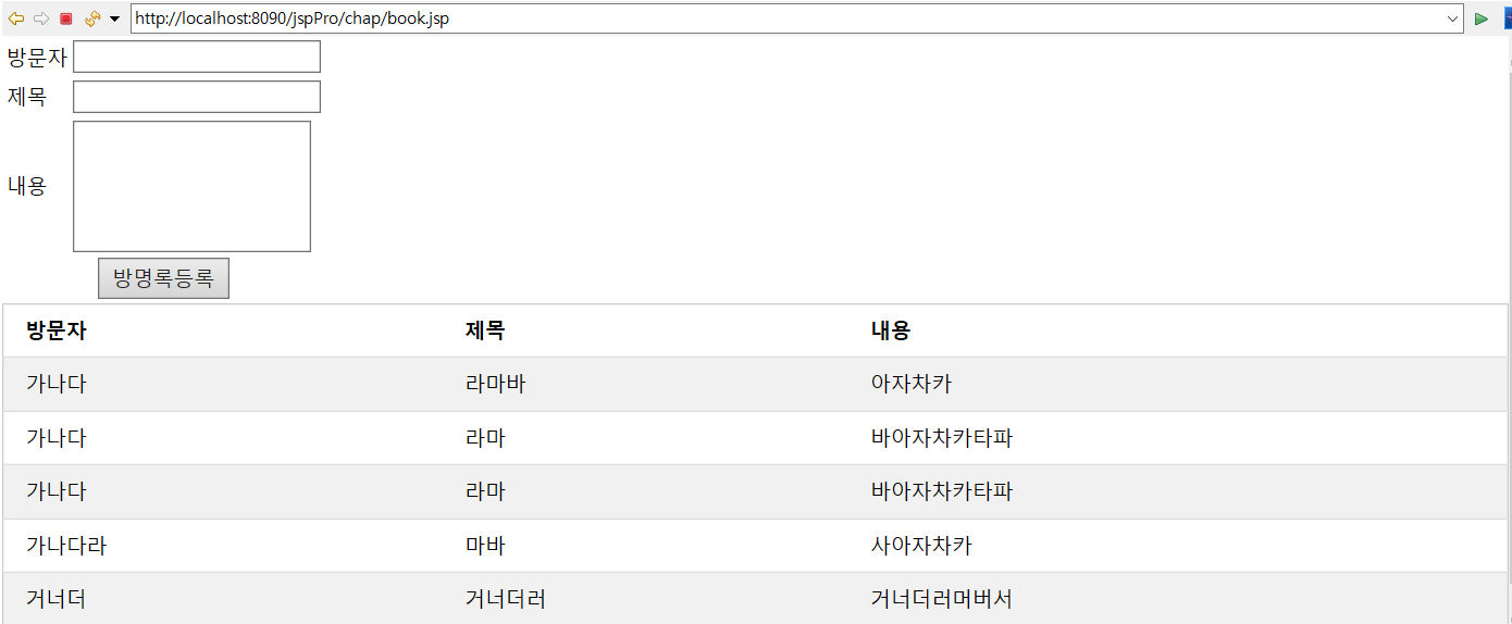 <%@page import="book.Book"%> <%@page import="java.util.ArrayList"%> <%@page import="java.util.List"%> <%@page import="book.BookService"%> <%@page import="java.sql.ResultSetMetaData"%> <%@page import="java.sql.ResultSet"%> <%@page import="java.sql.PreparedStatement"%> <%@page import="java.sql.Connection"%> <%@page import="java.sql.DriverManager"%> <%@ page language="java" contentType="text/html; charset=UTF-8" pageEncoding="UTF-8"%> <!-- book.BookService 1) 입력 받아서 저장 2) 저장된 내용 리스트 보기 3) util.DBConnection : database 연결을 위한 class 4) DB 생성 create table book( writer varchar(20), title varchar(100), content varchar(3000)); --> <% request.setCharacterEncoding("UTF-8"); List<Book> li = new ArrayList<Book>(); if(request.getParameter("writer")!=null){ BookService bs = new BookService(); bs.bookInsert(request); li = bs.bookList(); } %> <!DOCTYPE html> <html> <head> <meta charset = "UTF-8"> <title>Insert title here</title> </head> <link rel="stylesheet" href="https://www.w3schools.com/w3css/4/w3.css"> <body> <form method="post"> <table> <tr><td>방문자</td> <td><input type="text" name="writer"></td></tr> <tr><td>제목</td> <td><input type="text" name="title"></td></tr> <tr><td>내용</td> <td><textarea name="content" rows="5"></textarea></td></tr> <tr><td colspan="2" align="center"> <input type="submit" value="방명록등록"></td></tr> </table> </form> <table class = "w3-table-all"> <tr><th>방문자 </th><th>제목</th><th>내용</th></tr> <% for(Book b : li){ %> <tr><td><%=b.getWriter() %></td> <td><%=b.getTitle()%></td> <td><%=b.getContent()%></td></tr> <% } %> </table> </body> </html>