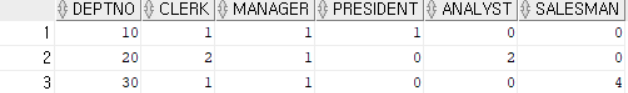 count(decode(job, 'CLERK', 1)) clerk, -- 문자열은 대소문자 구분한다. 이름은 대문자다.
