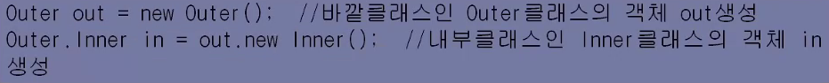 -> 다른 클래스에서 Outer 클래스의 내부클래스인 Inner 클래스에 접근하기 위해서 객체를 생성할 때는 먼저 바깥 클래스의 객체를 생성해서 그 레퍼런스를 가지고 내부 클래스의 객체를 생성한다.