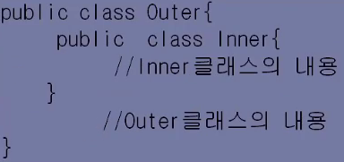 -> 내부 클래스(중첩 클래스: nested class)는 바깥 클래스(Outer class)의 다른 멤버(메소드, 멤버변수를 말함) 와 같은 클래스의 멤버가 된다.