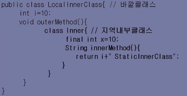 int i = 0; // 이 i 처럼 메소드 안의 지역변수는 지역 내부클래스에서 사용되려면 final 이어야 한다.