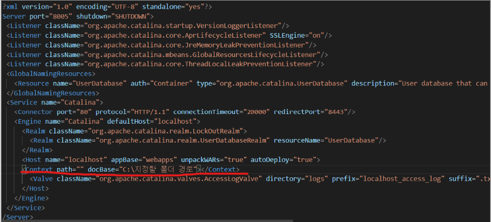 <Context path="" docBase="C:\지정할 폴더 경로"></Context>